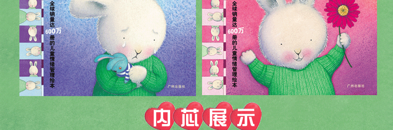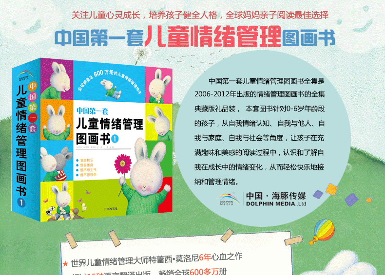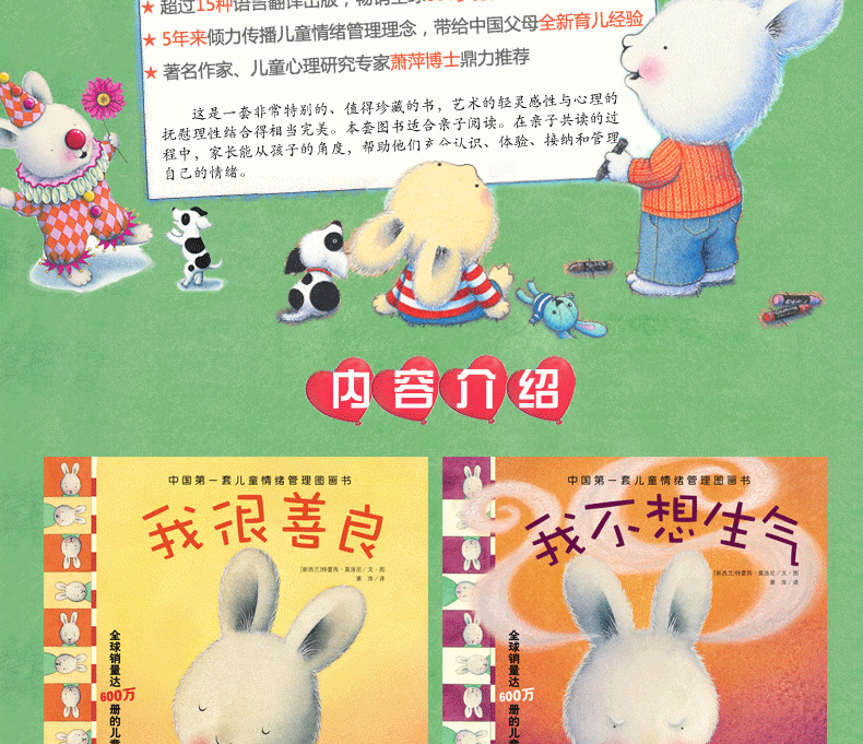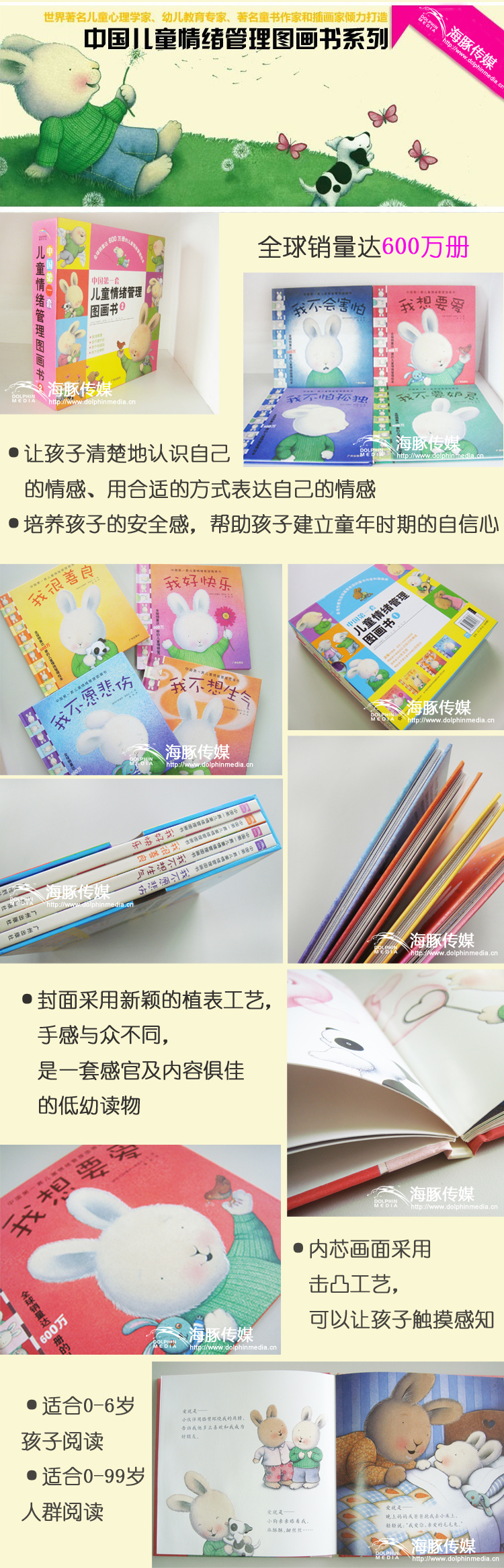 本 套叢書是一套2-5歲幼兒情緒的生動寫照,通過小兔子的形像表達了這個年齡段幼兒所面臨的各種各樣的情緒情境。畫面精致美觀,色彩非常具有感染性。生動的 烘托了主題。也告訴家長不要忽略及小視幼兒成長期中各種情緒的表現。要重視他們的情感要求并做出正確的輔導,與孩子共同成長。